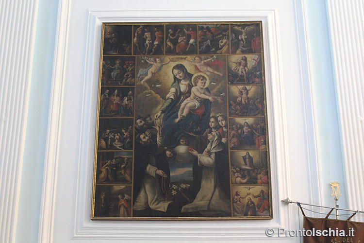 Originariamente la chiesa di San Rocco era una confraternita dedicata alla Madonna del Rosario, di cui tuttora è presente una tela, "sorella" dell'altra custodita nella Basilica Santa Maria di Loreto a Forio. La Madonna del Rosario di Barano è con tutta probabilità opera di Casare Calise, pittore foriano del '600, celebre per il suo stile tardo-manierista, diverso, diversissimo, dal gusto neo-classico che un secolo dopo caratterizzerà, invece, le opere di Alfonso Di Spigna, l'altro "pennello sacro" dell'isola d'Ischia, lacchese di nascita.