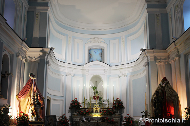Se i centri abitati sono molti più dei sei comuni in cui è divisa amministrativamente l'isola, il numero di chiese è, a sua volta, molto maggiore delle frazioni, dei borghi e dei villaggi sparsi per il territorio. Per rendersene plasticamente conto basta raggiungere Piazza San Rocco a Barano d'Ischia. All'inizio e alla fine della piazza ci sono, infatti, due chiese, una di fronte l'altra: a valle, la parrocchia di San Sebastiano, e su in cima la chiesa di San Rocco, patrono di questo comune collinare secondo, per estensione, soltanto a Forio.