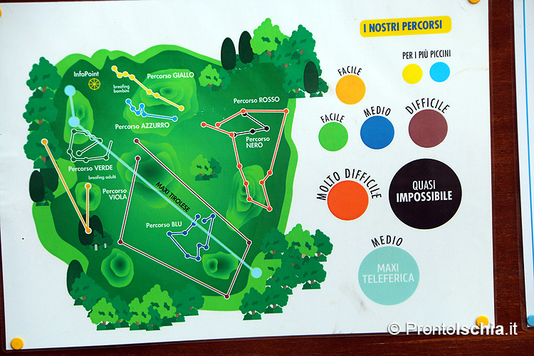 4*) il percorso Viola, per ragazzi e adulti da 150 cm. Di gran lunga il più gettonato con 5 teleferiche lunghe a varia altezza;