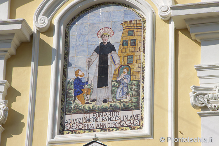 Quanto alla facciata, tre gli aspetti da sottolineare: il frontone arrotondato, il pannello maiolicato raffigurante San Leonardo e il massiccio campanile con l'orologio sul lato destro. Il maiolicato del santo venne realizzato ai primi del '900 su mandato degli emigranti panzesi che avevano lasciato l'isola in cerca di fortuna oltreoceano.