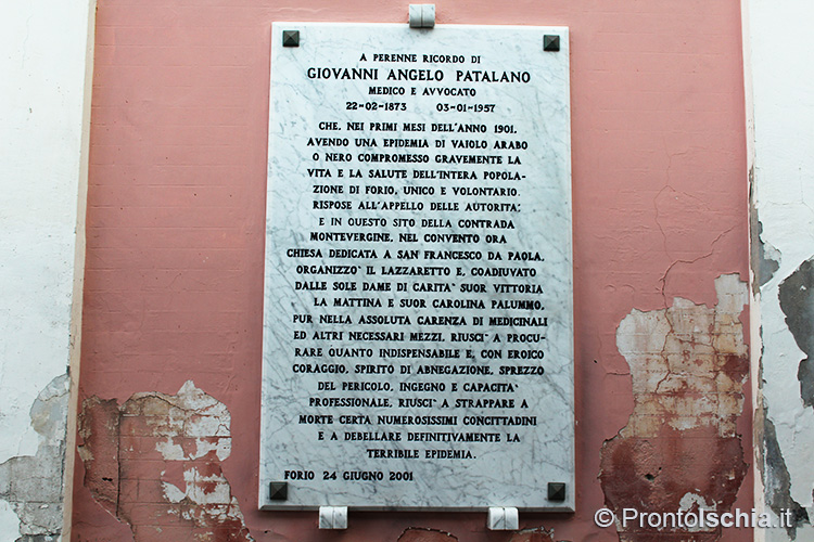 Detto brevemente della storia, c'è un episodio, per altro ricordato in una lapide marmorea all'esterno della chiesa, che merita di esser raccontato. Il riferimento è al medico e avvocato foriano Giovanni Angelo Patalano (1873-1957) che nel 1901, non ancora trentenne, si prese personalmente cura dei numerosi malati di vaiolo arabo che stava decimando la popolazione di Forio in quell'inizio secolo. Il lazzaretto venne realizzato proprio nella chiesa e, pur in penuria di medicinali e scarsità di mezzi, il medico Patalano riuscì a salvare molte vite mettendo decisamente in secondo piano la possibilità, affatto remota, di essere egli stesso contagiato dall'epidemia. Un atto di eroismo che un secolo dopo, nel 2004, è valso al Patalano l'intitolazione del tratto di strada dell'ex statale 270 che conduce al popoloso quartiere di Monterone.