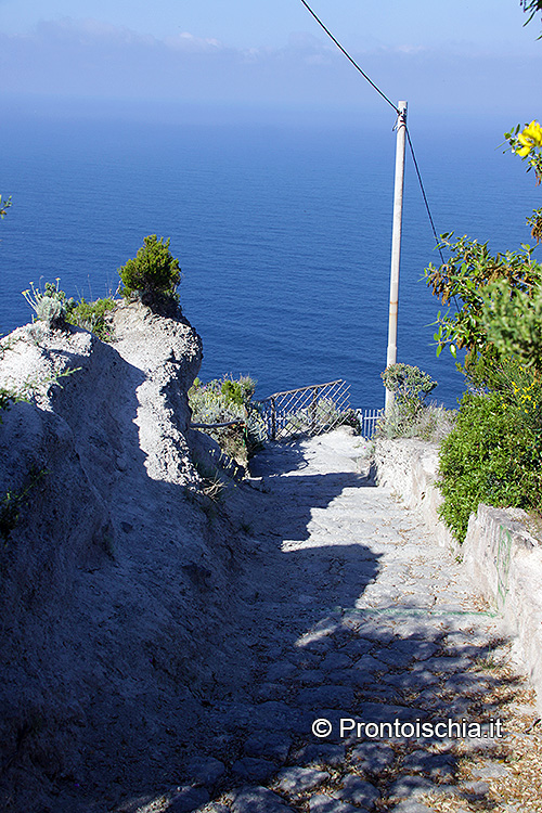 E allora vale la pena andare a vedere questo gigante, imboccando Via Costa, una strada secondaria sulla destra della Strada provinciale che congiunge il comune di Forio alla frazione giuridica di Panza. È ormai una strada residenziale, dove negli anni sono state costruite abitazioni di pregio, anche se, come spesso capita di osservare a Forio, la valorizzazione turistica del territorio non ha eliminato del tutto le tracce rurali degli antichi agglomerati. Così, tra ville a picco sul mare, "parracine" (i caratteristici muri a secco a delimitazione degli orti e delle vigne) e una rigogliosa macchia mediterranea, si arriva dopo un percorso tutto in salita, a quest’edificio bianco affacciato sulla baia di Citara.