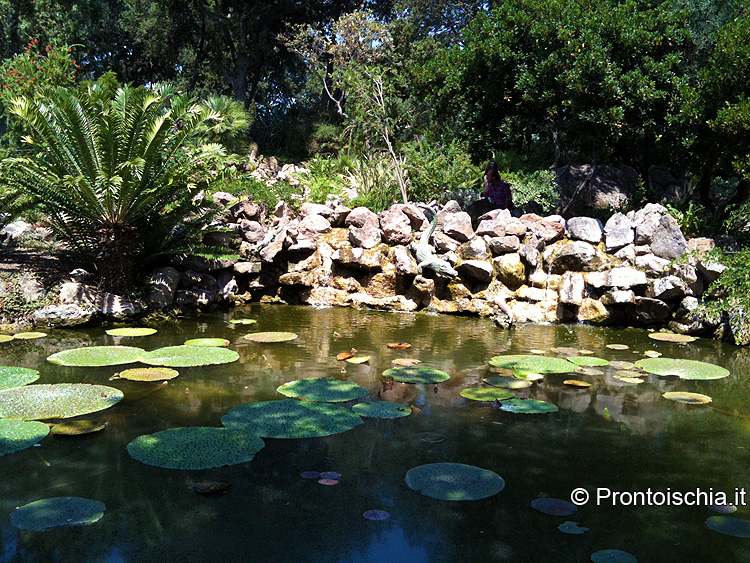 La Mortella ospita migliaia di piante mediterranee e tropicali. Tra queste spicca la collezione di piante acquatiche, in cui regna indiscussa la Victoria amazonica. Questa pianta, originaria del Rio delle Amazzoni, cresce in una vasca del giardino a valle, dominata da una scultura di Simon Verity che raffigura un’enorme bocca. Le sue foglie possono raggiungere due metri di diametro e i gambi otto metri di altezza. I suoi fiori ermafroditi cambiano sesso e colore in un solo giorno: nascono femminili e bianchi, per poi trasformarsi in maschili e rossi. I fiori femmina si aprono al calar del sole e rimangono aperti fino al mattino, mentre quelli maschili sbocciano nel primo pomeriggio.