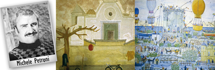 Del resto, sono gli aneddoti, i frammenti di vita che, in parte, compensano la biografia scarna di quest’artista. Tranne, infatti, gli anni della giovinezza che lo vedono impegnato prima come operaio edile e poi come bagnino, Michele Petroni è sempre e solo vissuto della sua arte, cimentandosi, da principio, con il collage (coi ritagli di stoffa della madre sarta) per poi passare, ancora giovanissimo, alla pittura. La critica, di volta in volta, ha definito la sua arte naif, primitiva, surreale. Per la restante parte, tutti concordi, invece, nel sottolineare l’assolutà particolarità del talento artistico, in cui la spiccata espressività degli olii e degli acquerelli compensava la scarsa tecnica pittorica.