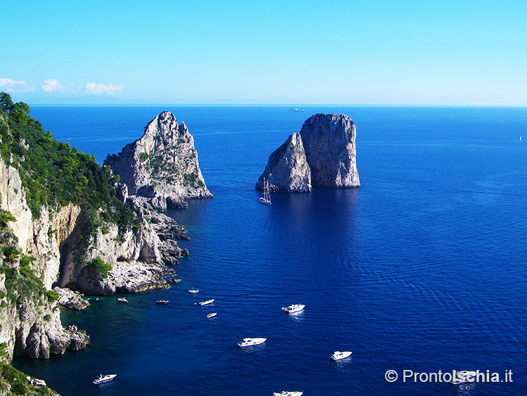 Procida e Capri sono tutte a poche miglia di navigazione, e perciò non approfondire, almeno un po', la conoscenza delle tante meraviglie del Golfo più bello del mondo sarebbe un vero peccato. Dovendo scegliere, suggeriamo Capri, specie d'estate quando i collegamenti diretti con Ischia sono frequenti. La Grotta Azzurra, la vista dei Faraglioni dal belvedere di Via Tragara, i Giardini di Augusto, la splendida Villa San Michele di Axel Munthe sono alcune delle bellezze che si possono ammirare in un giorno a Capri, una delle isole più famose al mondo a solo un'ora di aliscafo da Ischia.