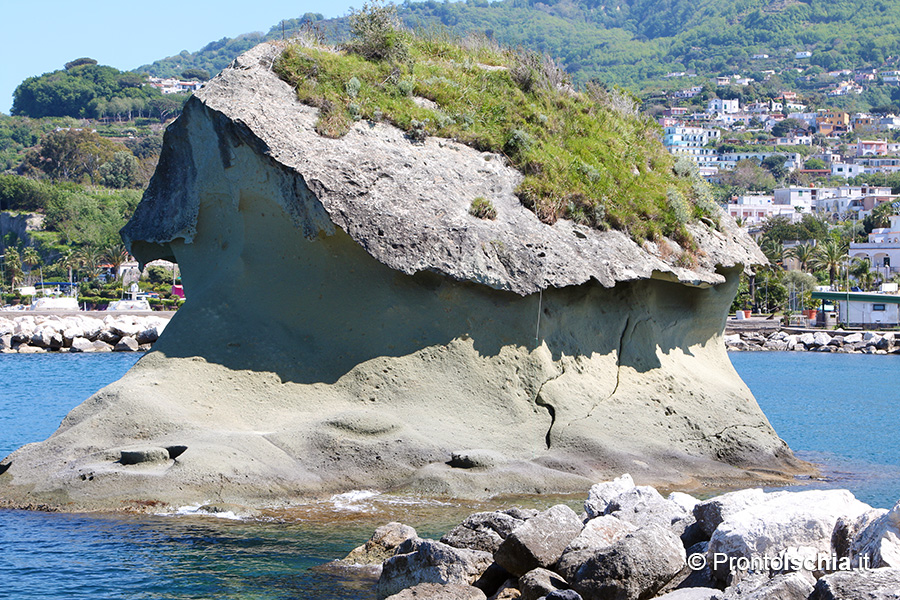 Le pietre dell'isola d'Ischia 11Il Fungo si trova all'ingresso del Corso Angelo Rizzoli di Lacco Ameno. Da un punto di vista geologico è uno dei tanti mega blocchi di tufo di cui è pieno il fondale del porto lacchese, ma non è certo alla geologia che è dovuta la sua fama. Il Fungo, infatti, è una delle cartoline più famose dell'isola. Secondo Cervera, "dimora eterna" di due giovanissimi amanti a cui il destino aveva negato la fuga d’amore nell’immenso mare di Ischia.