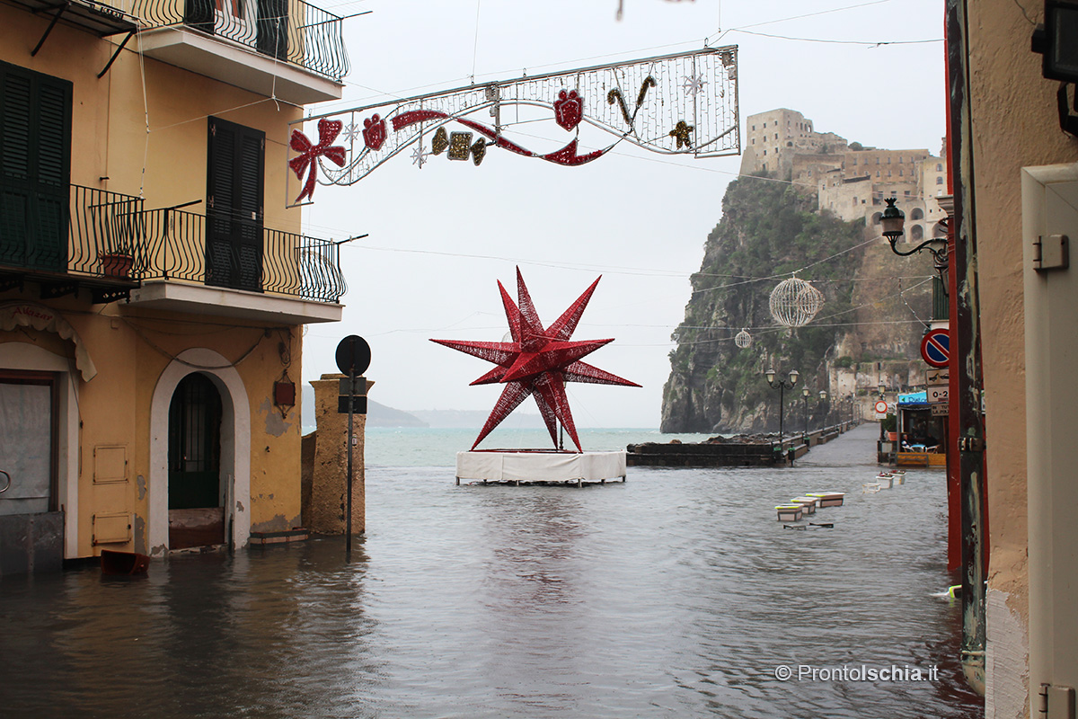 Infine c'è lo spettacolo dell'acqua alta nel borgo di Ischia Ponte. A causa dei venti di scirocco e libeccio, il mare invade il piazzale aragonese insinuandosi lungo la strada fin quasi all'altezza della Cattedrale dell'Assunta. A onor del vero la circostanza crea qualche disagio sia ai commercianti che alle auto in transito. Quanto ai pedoni, se il vento e il mare impazzano troppo è meglio rimandare la visita al borgo di Ischia Ponte. Viceversa se il tempo, pur inclemente, consente il passaggio, vale la pena assistere da vicino al fenomeno dell'acqua alta.