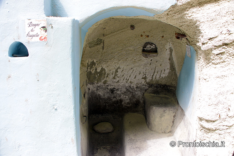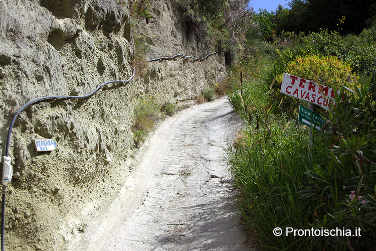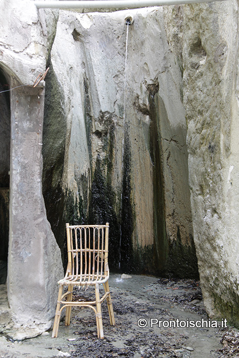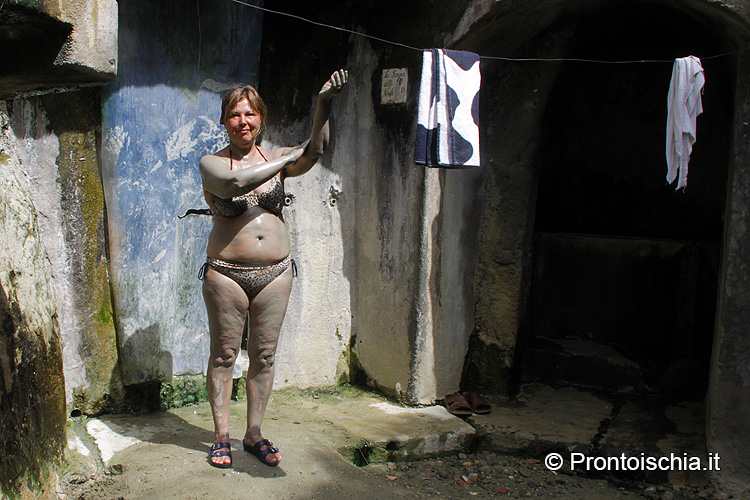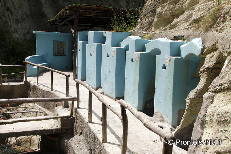 , si arriva a quella che è una vera e propria sala termale all’aperto, pare, già nota ai Romani che colonizzarono Ischia nel IV secolo a. C. Sono state scavate nella roccia delle piccole celle per fare la doccia, oltre a delle grotte in cui è possibile immergersi totalmente nelle acque bollenti che sgorgano dalla montagna. C’è, ça va sans dire, la sauna naturale, per non dire della possibilità esclusiva di applicare sul corpo i fanghi naturali originatisi dal contatto dell’acqua termale con l’argilla delle pareti rocciose.
