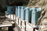 Al contrario, per arrivare alle terme bisogna avventurarsi per una gola che si apre alle spalle della spiaggia, camminando per un sentiero con a fianco un ruscello d’acqua che scorre in un piccolo letto fra le pareti tufacee della collina.