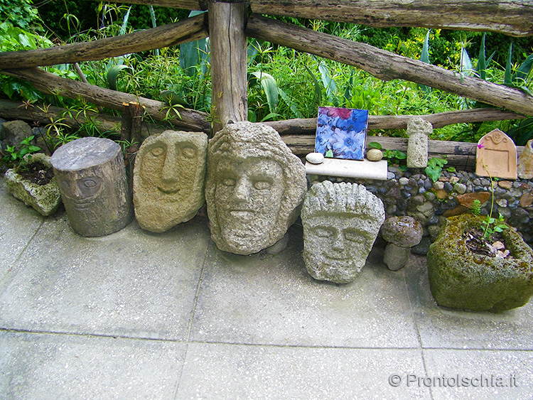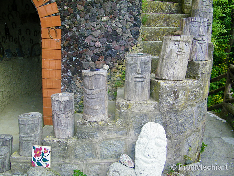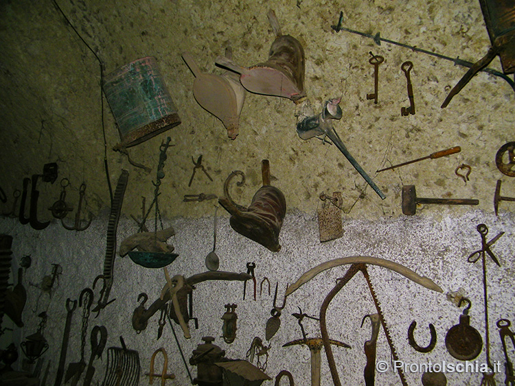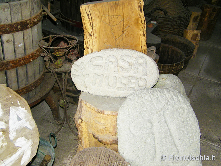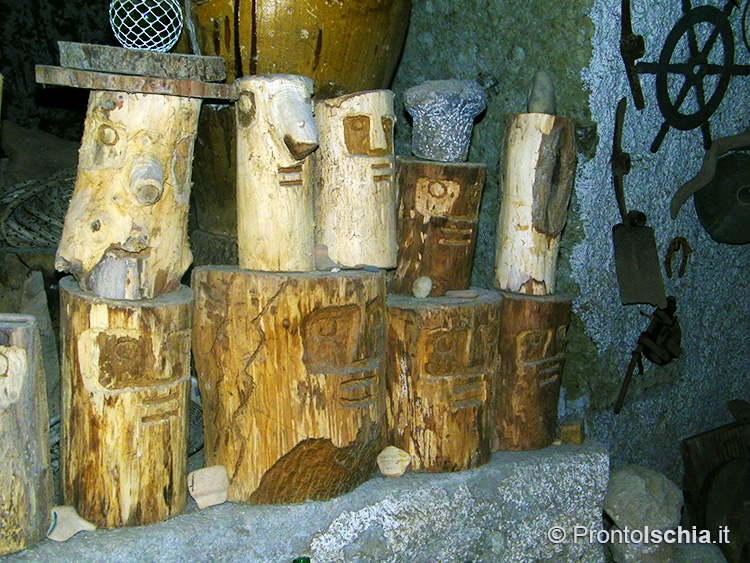Salvatore ha fatto di necessità virtù. Prima ha riconvertito la cantina, i cellai e la cisterna per la raccolta dell’acqua piovana nella casa dove per anni è vissuto insieme alla moglie e i suoi tre figli. Poi, quando sono andati a vivere altrove, ha trasformato quella casa in un museo dove ha raccolto e catalogato gli attrezzi anticamente in uso nella difficile arte della viticoltura a Ischia, insieme a una gran quantità di sculture in legno e pietra locale, l’onnipresente tufo verde del Monte Epomeo.